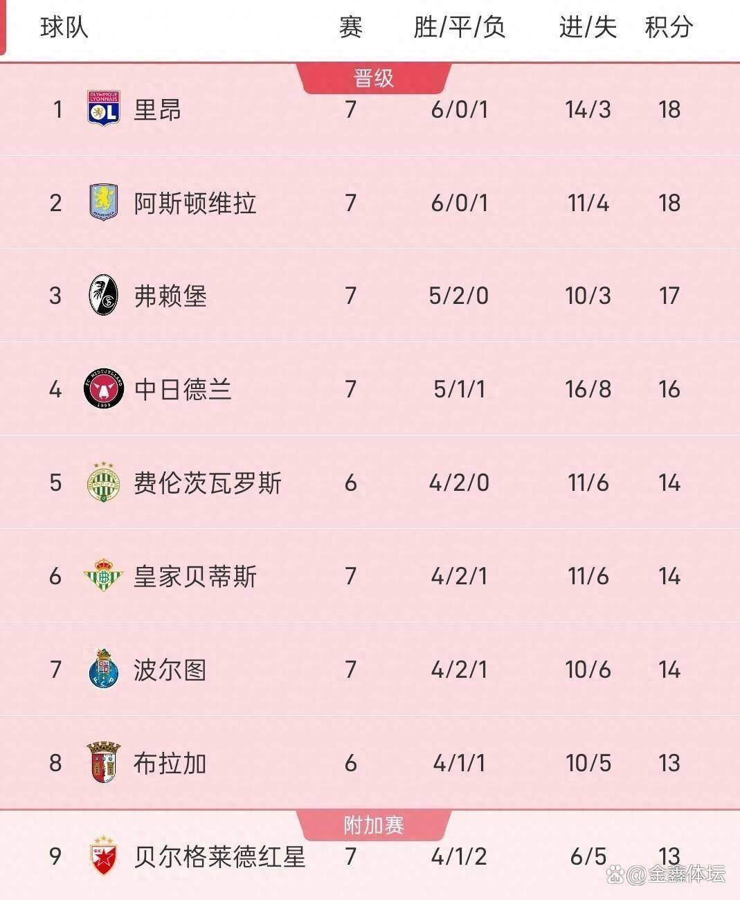 随着第七轮所有比赛结束,最新的欧联杯联赛阶段积分榜也正式出炉。 里昂和阿斯顿维拉同积18分,因为净胜球的不同分列第一和第二位。 由于联赛阶段前八名将直接晋级淘汰赛,这两支球队实际上已经提前一轮锁定了直通名额。 德国的弗赖堡积17分,排在第三位。 丹麦的中日德兰积16分,位列第四。 匈牙利的费伦茨瓦罗斯积14分,排在第五。