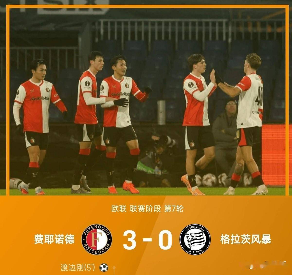 在荷兰,费耶诺德主场对阵格拉茨风暴的比赛相对平顺。 上半场第28分钟,日本后卫渡边刚就利用角球机会头球破门,为费耶诺德打开了胜利之门。 易边再战,第67分钟,穆萨在禁区前沿接球后一脚抽射,将比分扩大为2-0。 比赛结束前,老将博尔赫斯接到小范佩西的巧妙直塞,倒地扫射破门,将最终比分定格在3-0。 费耶诺德取得了一场完胜。