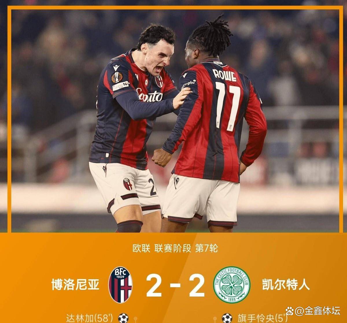 下半场第58分钟,博洛尼亚反超了比分。他们的进攻组织核心厄德高在右路送出一记精准的传中,前锋达林加力压防守球员,头槌破门,将比分改写为2-1。眼看凯尔特人就要在客场吞下一场败仗,他们的韧性在最后时刻得到了体现。 第72分钟,凯尔特人球员罗在禁区外来了一脚石破天惊的远射,皮球像出膛炮弹一样飞入球门死角,这是一记无可挑剔的世界波。 最终,十人作战的凯尔特人顽强地在客场2-2逼平了博洛尼亚,带走了一分。